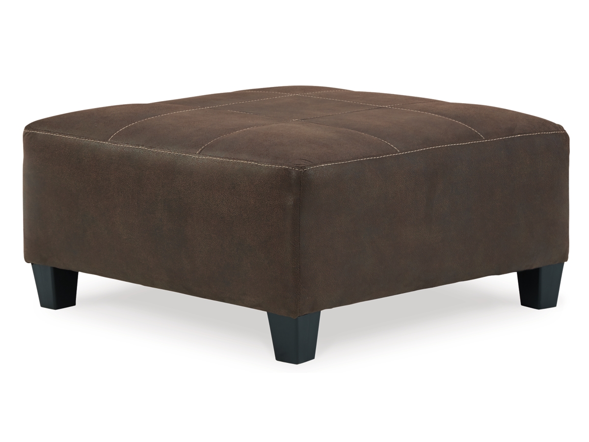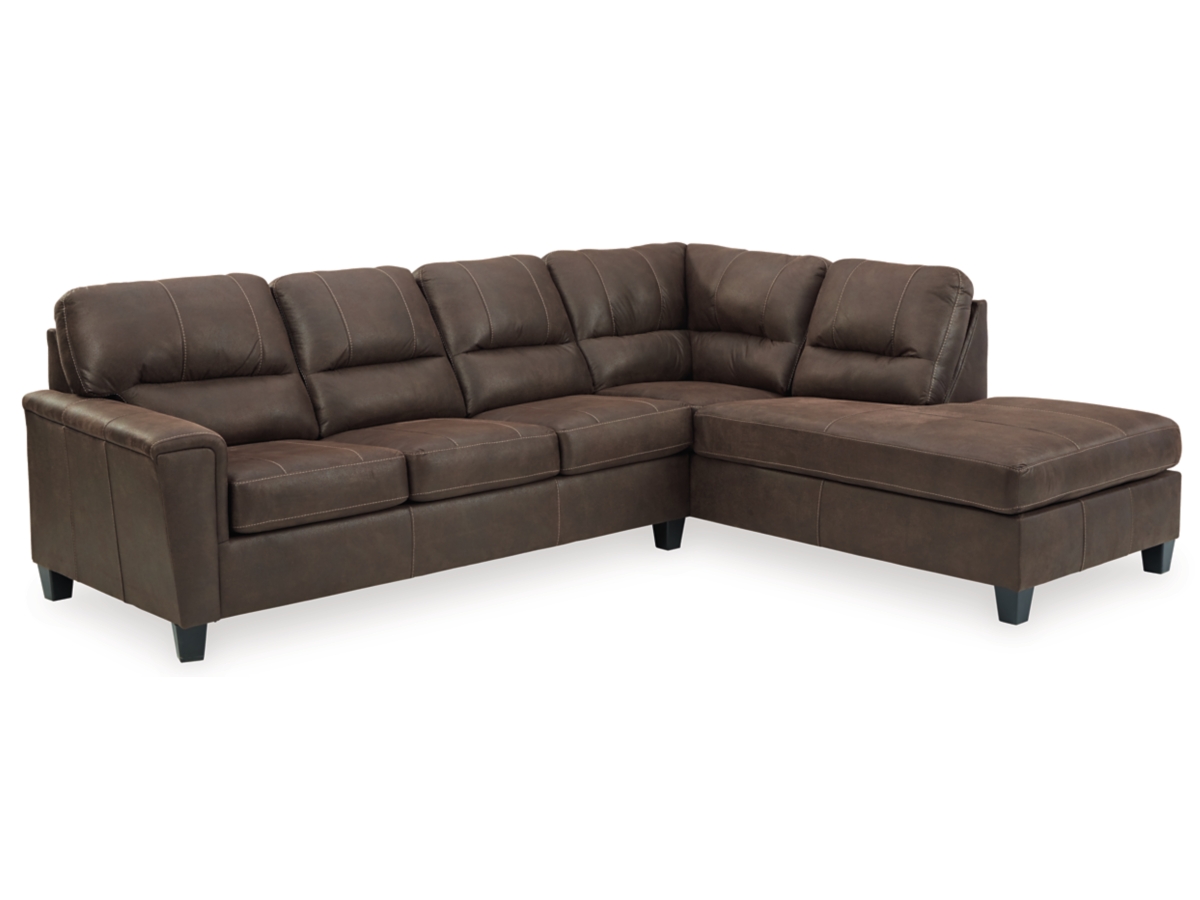 If you love the cool look of leather but long for the warm feel of fabric, you can take comfort in the Navi 3-piece set with sectional and ottoman. Wrapped in a fabulous faux leather with a weathered hue and hint of pebbly texture to resemble the real deal, this decidedly modern sectional set proves less is more. Elements include angled side profiling and track armrests wrapped with a layer of pillowy softness for that little something extra. Prominent jumbo stitching and clean-lined divided back styling lend fashion-forward flair.