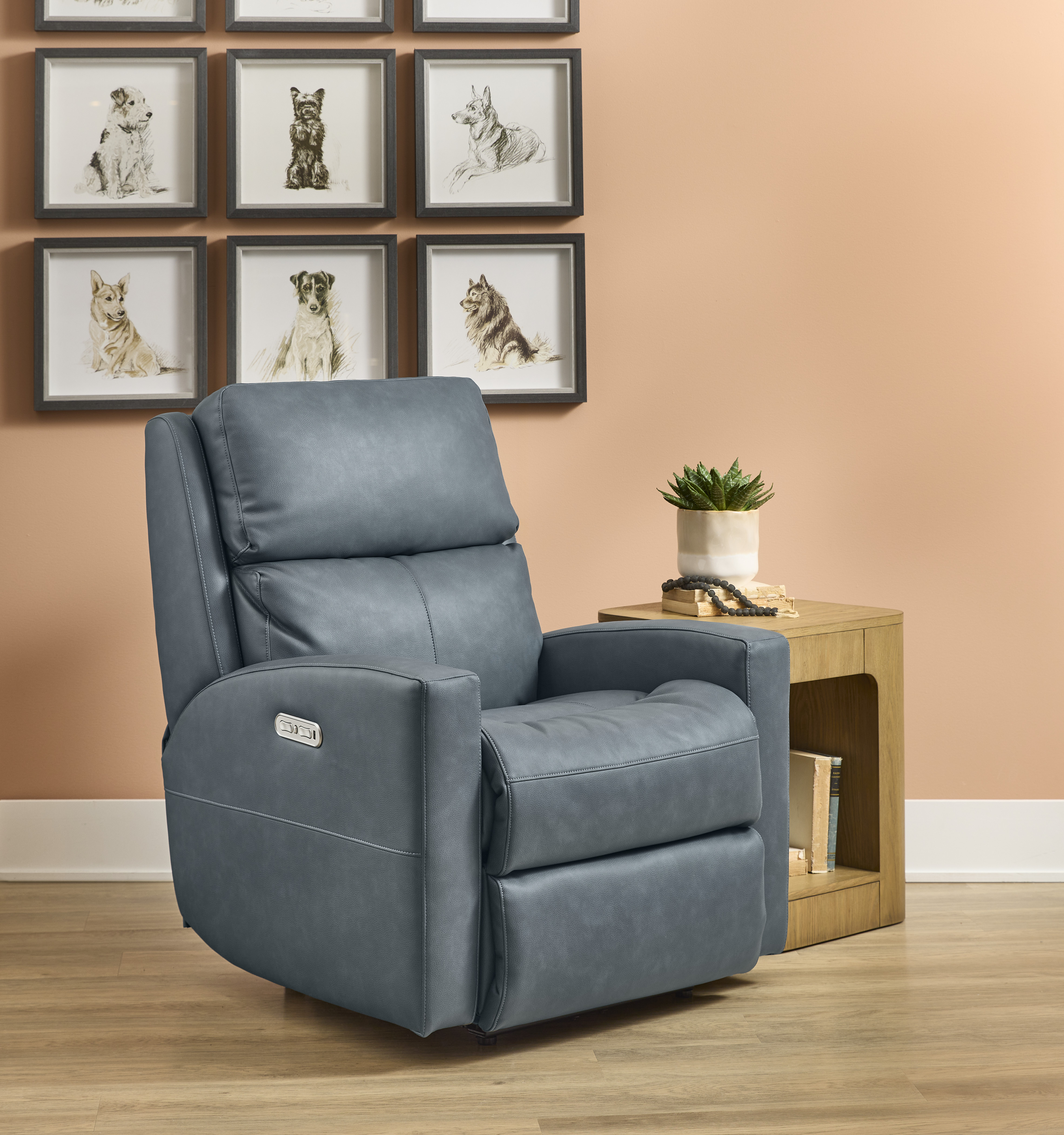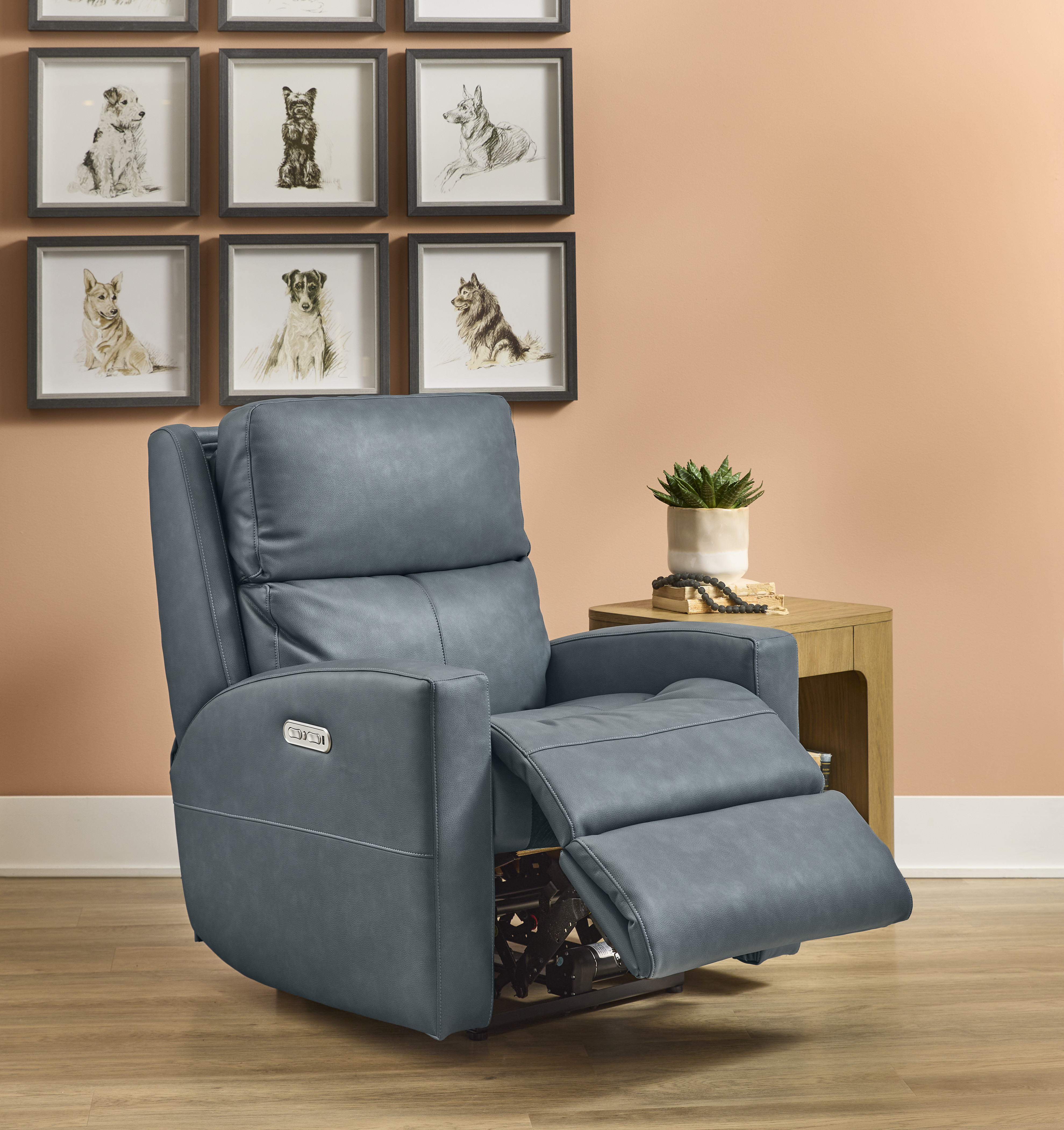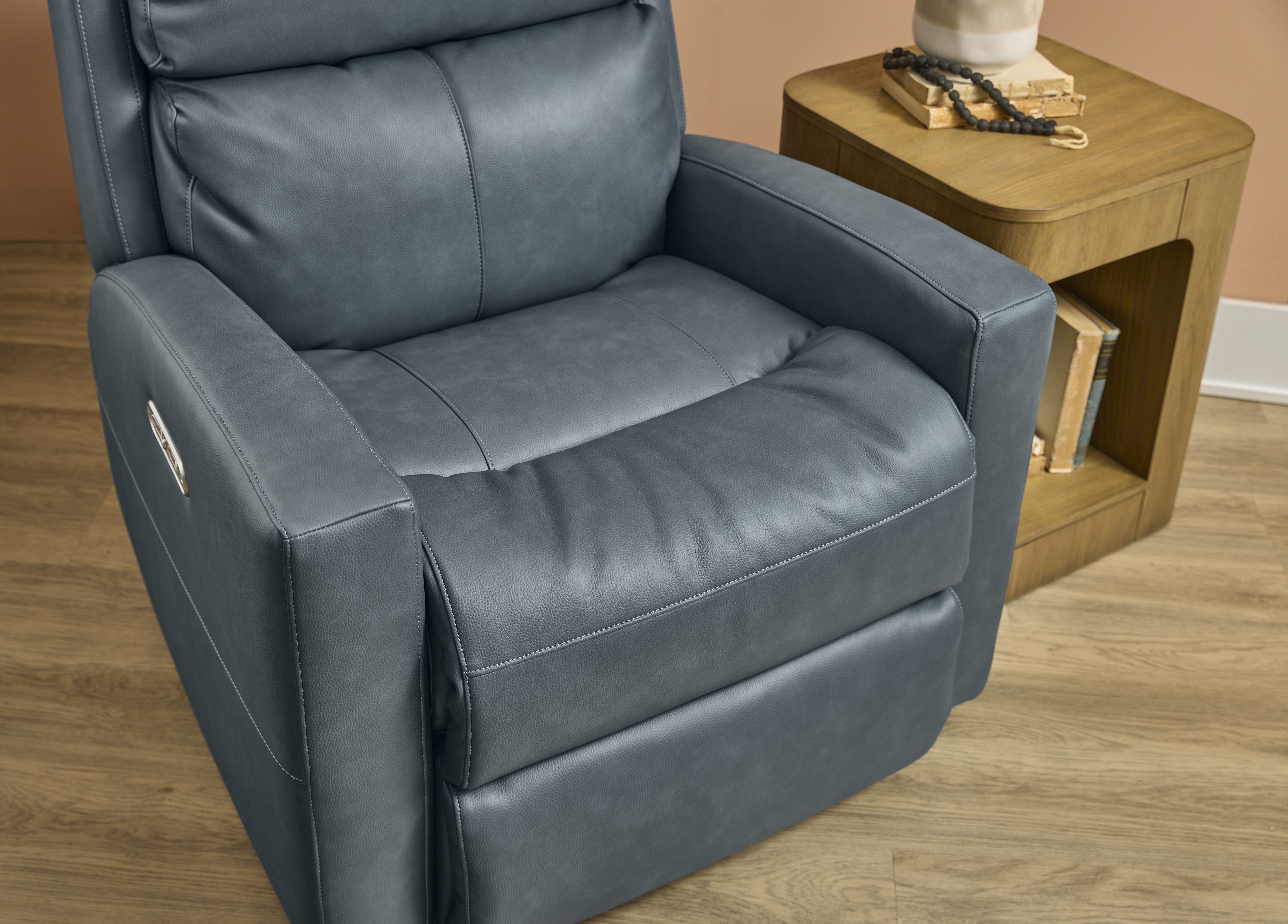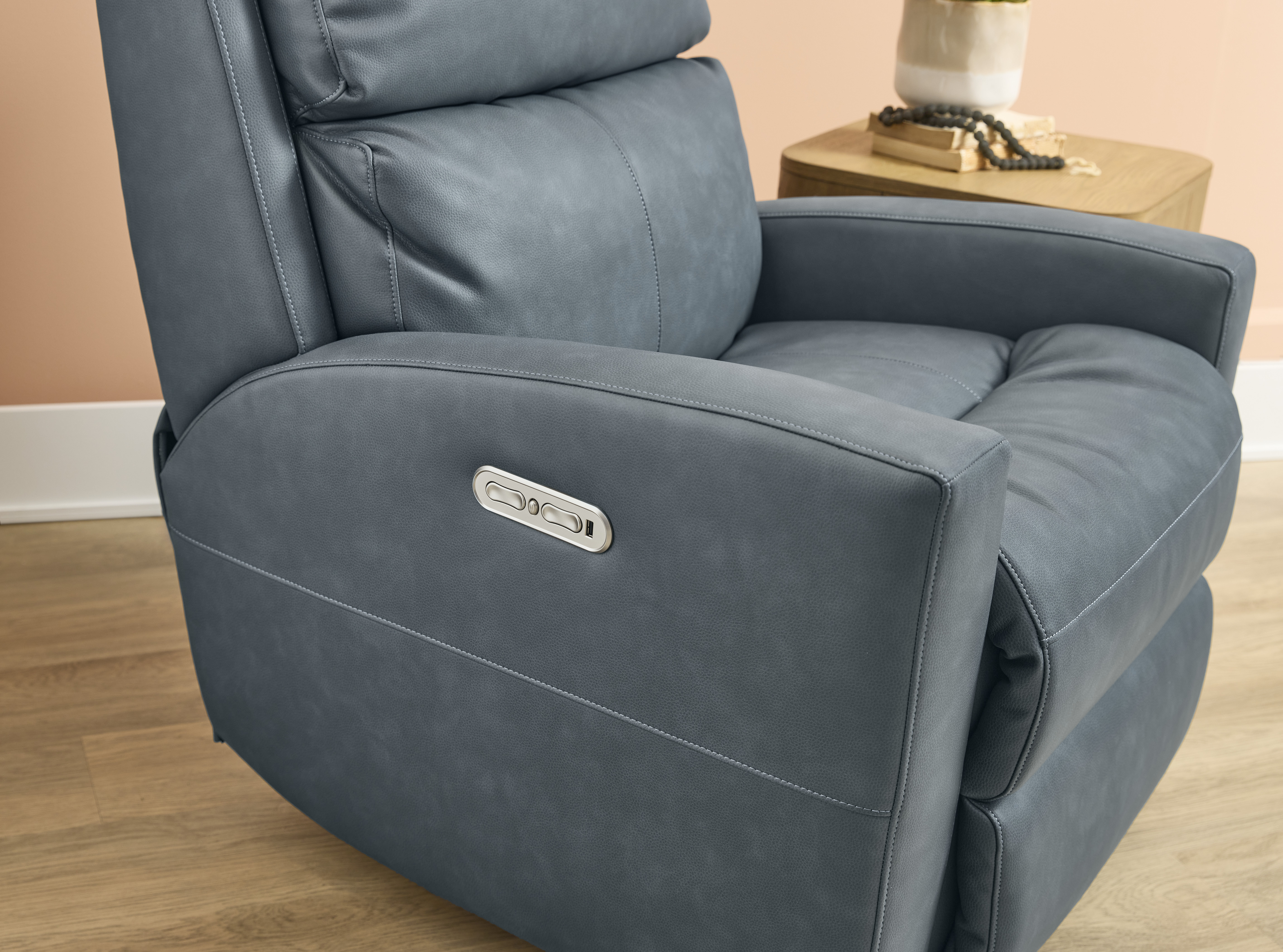 Contemporary-styled comfort invites all-day lounging with the Catalina power recliner with power headrest. Easily recline back, adjust the headrest, and unwind with the touch of a button in the arm. Catalina’s deep-set back wings and sloped arms offer a sleek aesthetic for living spaces, while a contoured seat, fully padded footrest and divided back cushion provide support for complete relaxation.