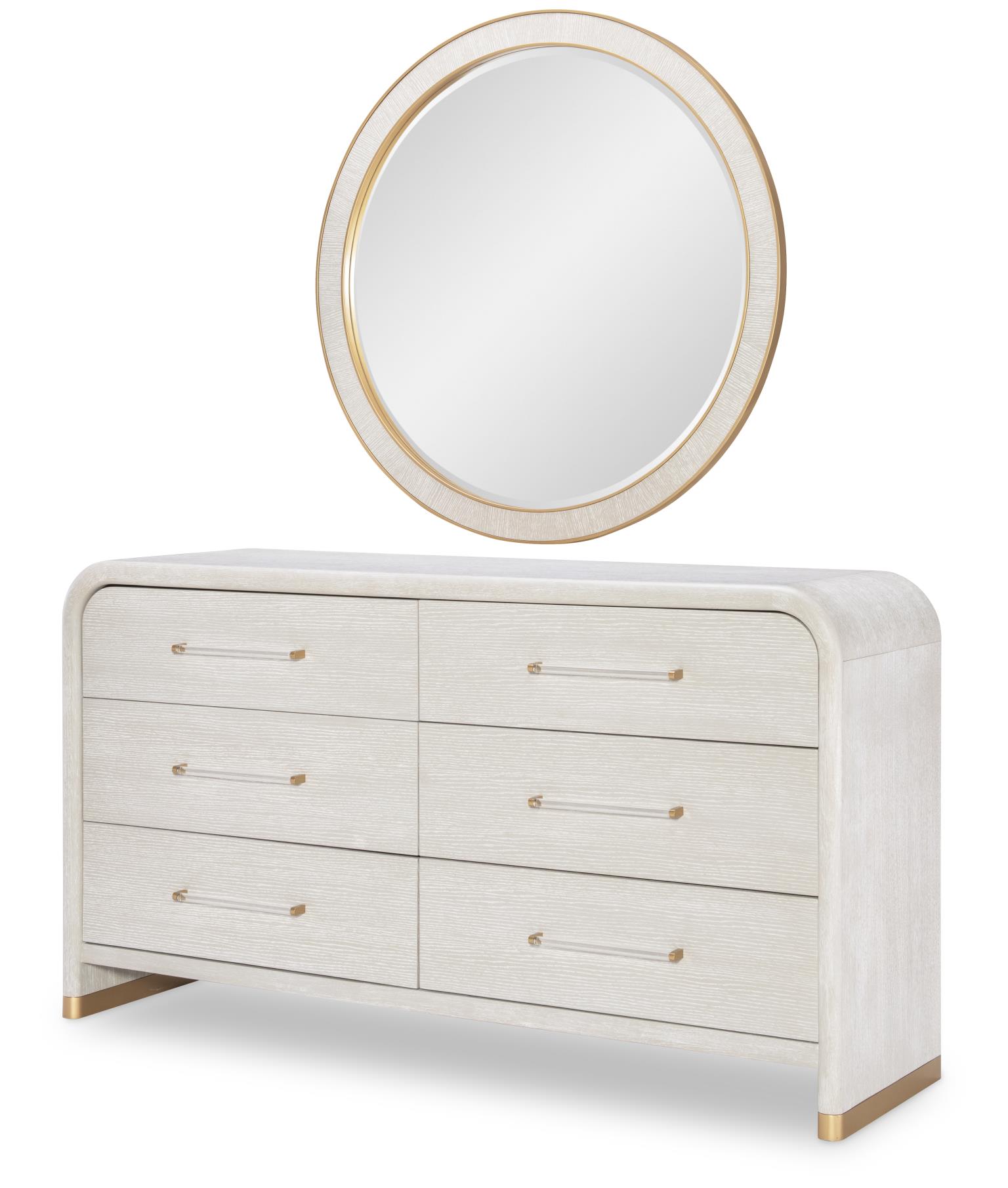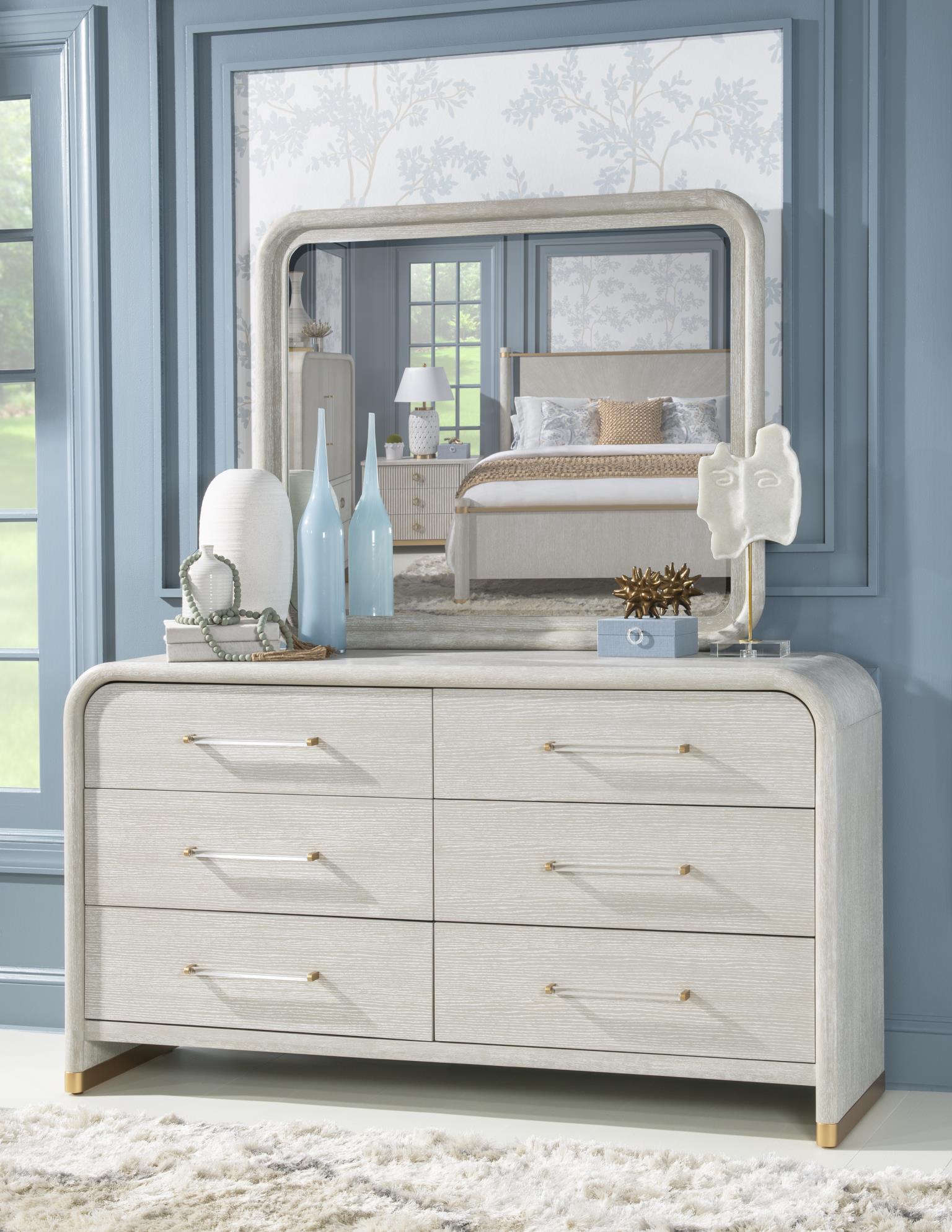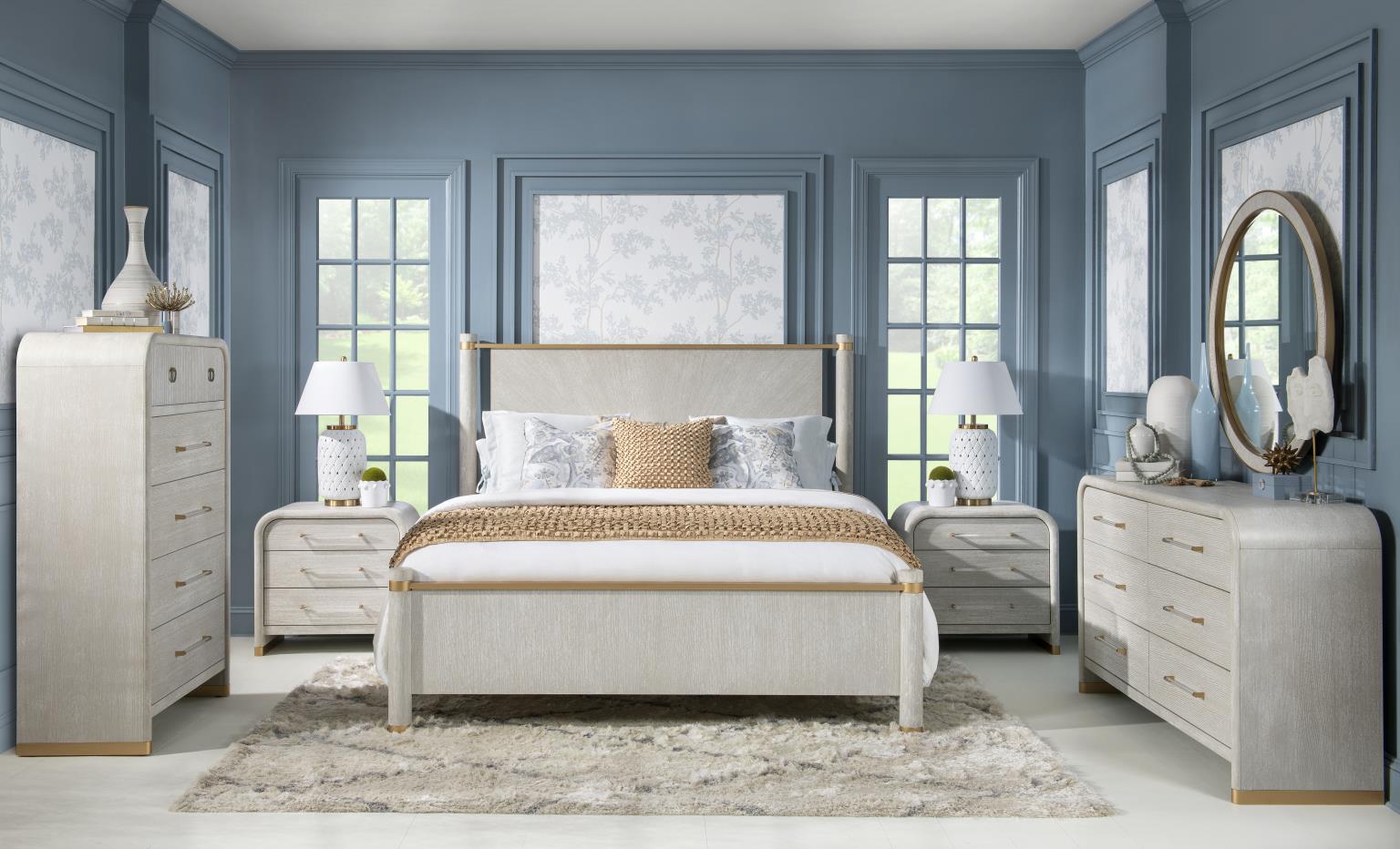 Approachable glamour. That's the look of the Miramar Total Home Collection from Legacy Classic - Modern. The collection features gold and acrylic accents, bold fluting detail and waterfall edges. The Muted Brass accent finish is used in banding on case bases and foot rails, table bases and on the posters of the Canopy Bed and low-post bed.